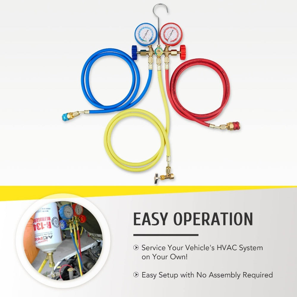 • WIDE APPLICATION: This car AC gauge set works with R134a, R12, R22, and R502 refrigerants; ideal for both DIY and professional HVAC maintenance, it allows you to measure your system's pressure, evacuate and refill coolant, and more