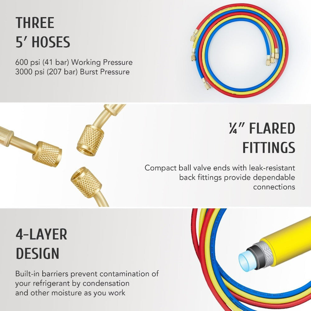 • COLOR-CODED HOSES: Blue for low, red for high, and yellow for charging, these durable PVC hoses have 4 reinforced layers to work with daily pressure up to 600 psi (burst pressure: 3000 psi)